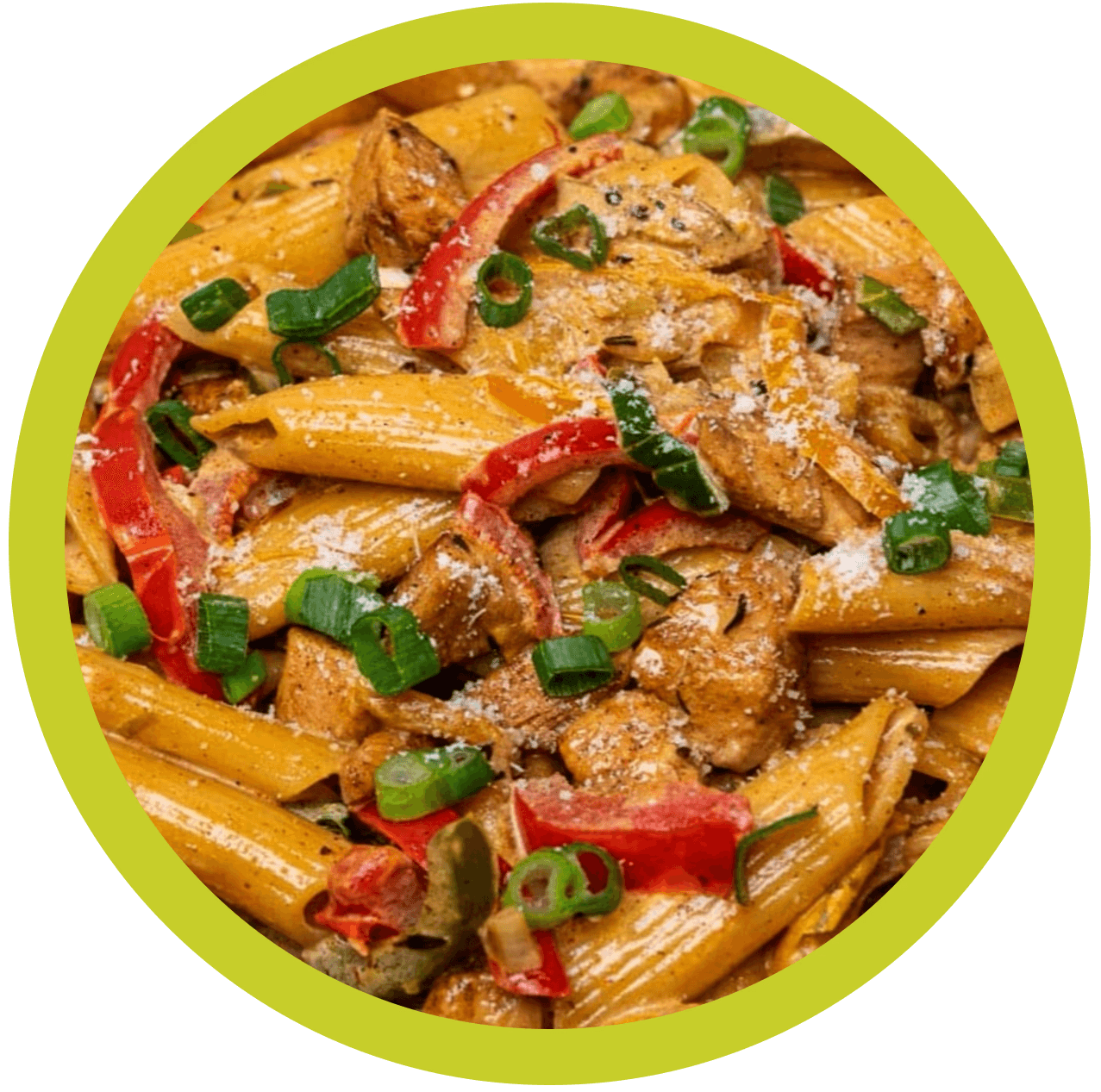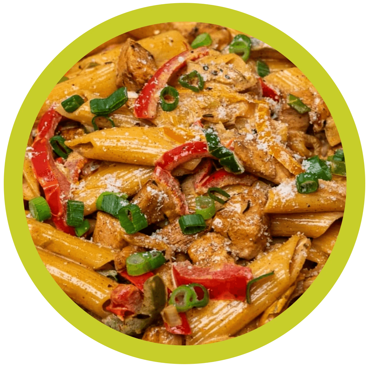 Penne with jerk chicken, bell peppers, green onion, and parmesan in a creamy jerk cream sauce.