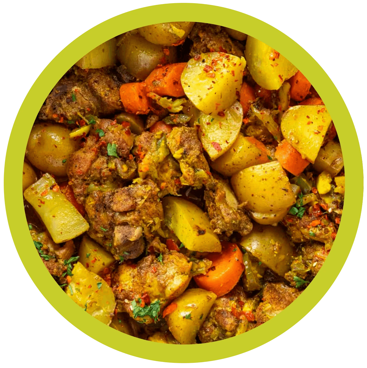 Bone-in chicken in a turmeric-rich Jamaican curry with potatoes and carrots. Served with rice and steamed cabbage.