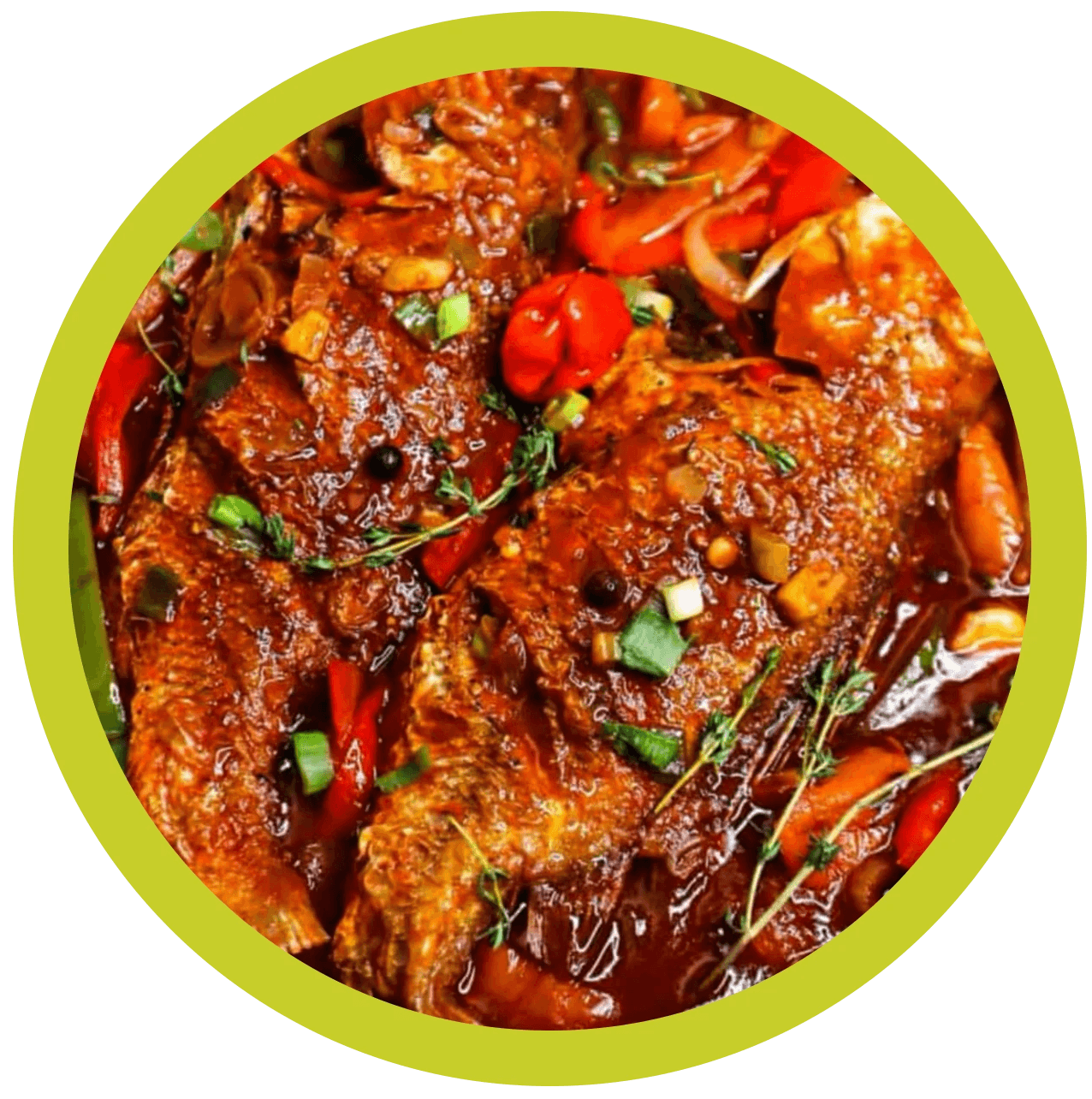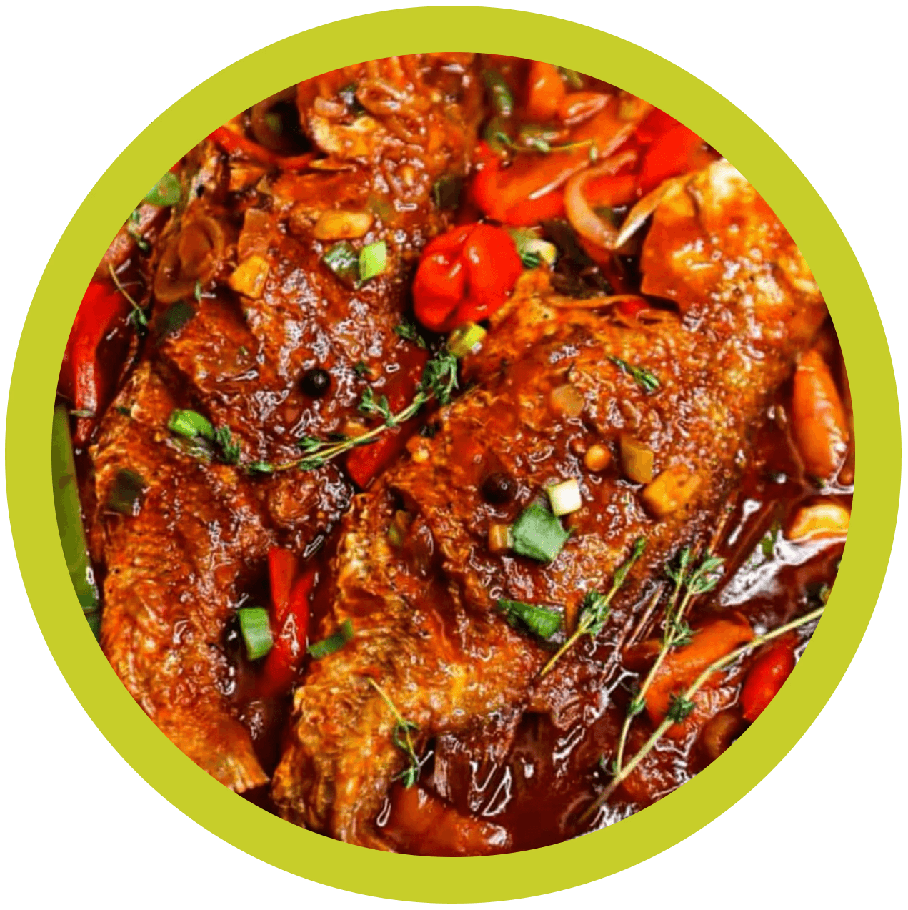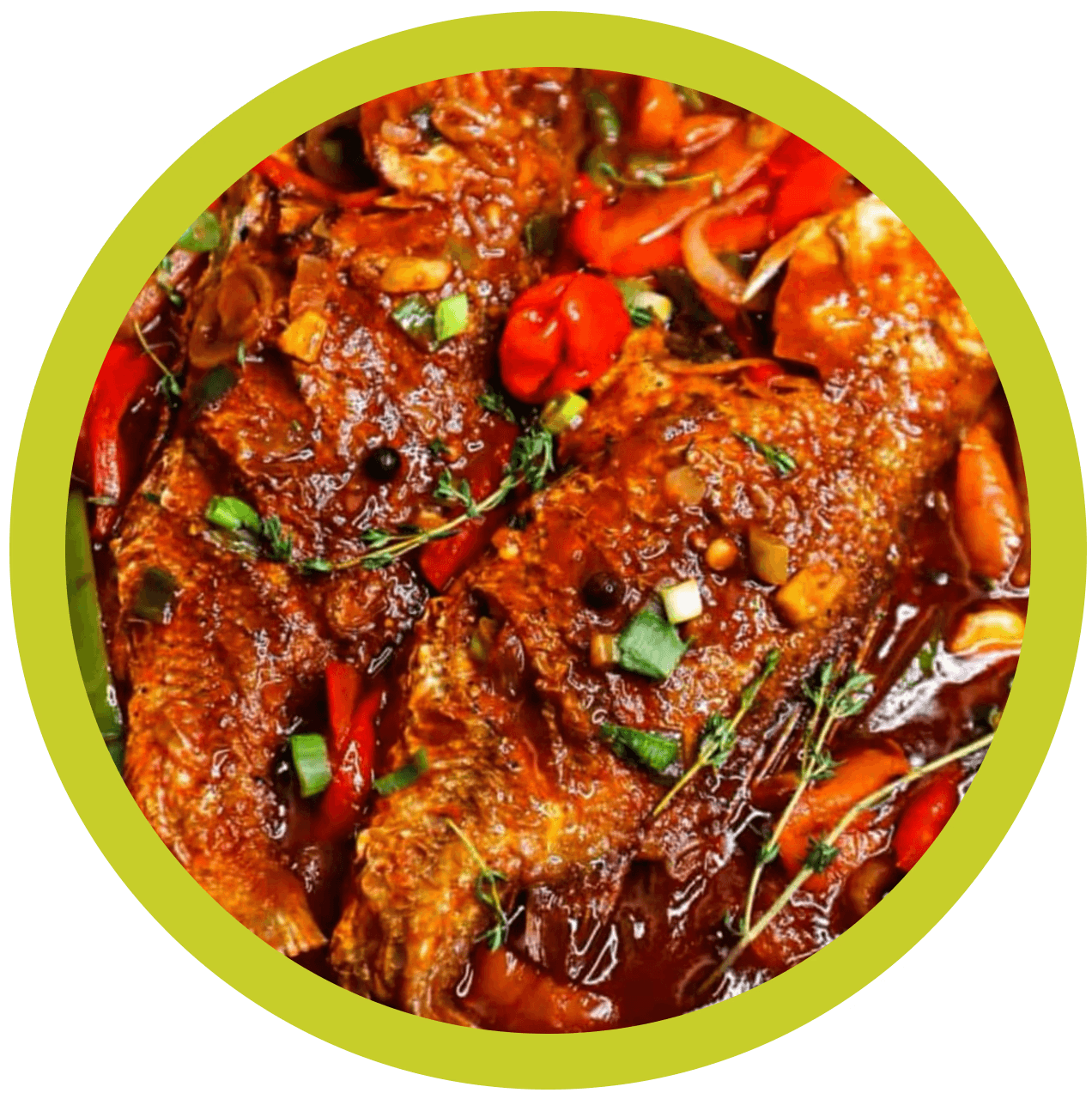 Fresh fish in a robust brown sauce with scotch bonnet, thyme, and tomato. Served with rice and steamed cabbage.
