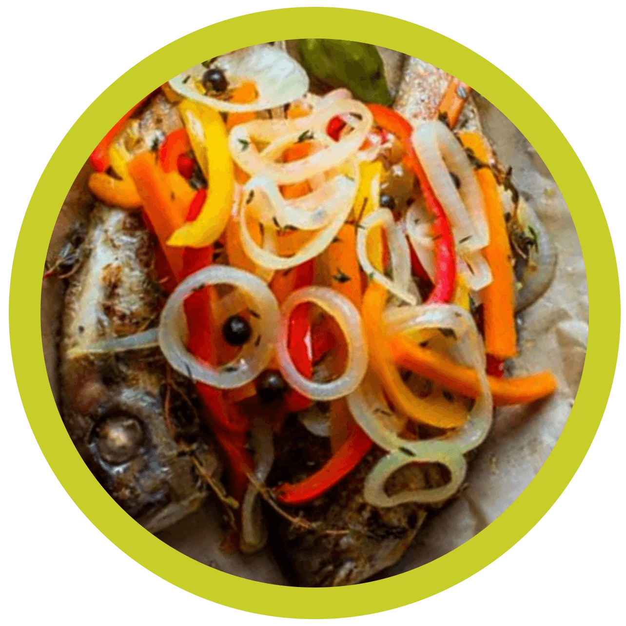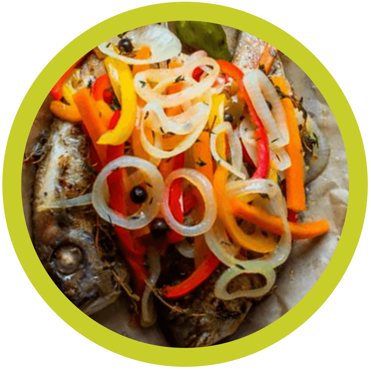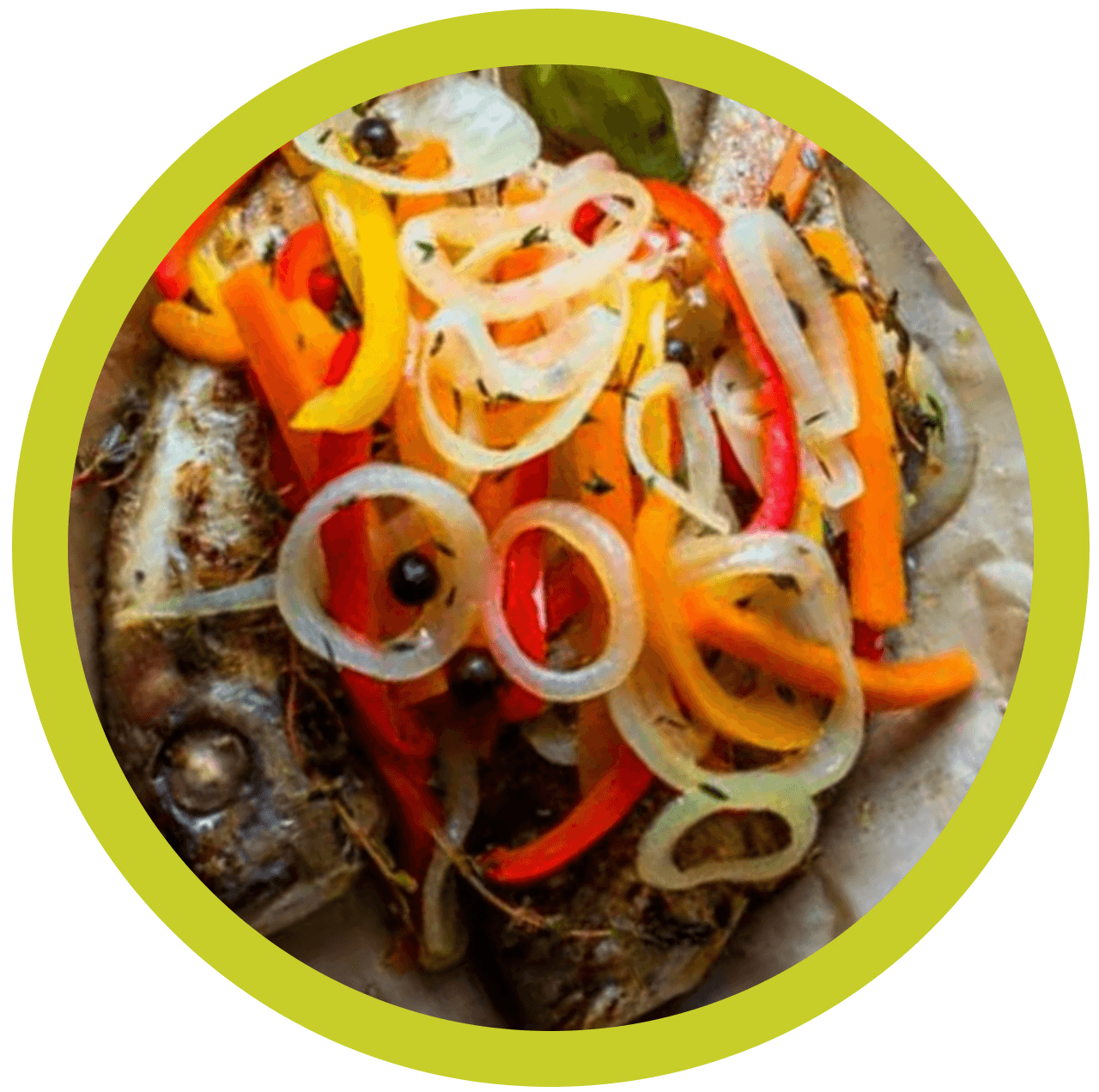 Crispy snapper topped with pickled onions, bell peppers, and pimento-vinegar escovitch sauce. Served with rice and steamed cabbage.