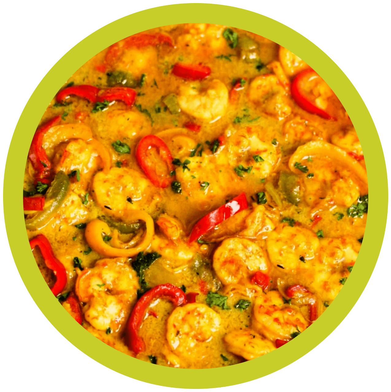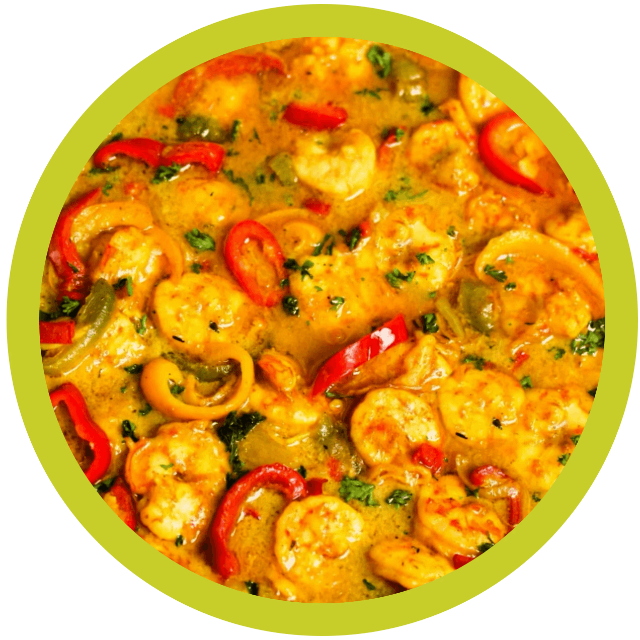 Jumbo shrimp in a golden coconut curry sauce with scotch bonnet and fresh herbs. Served with rice and steamed cabbage.